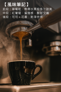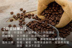 風味:花香、熟果香、橘子、莓果、蜂蜜、哈密瓜、蜜李甜感、酸度柔和